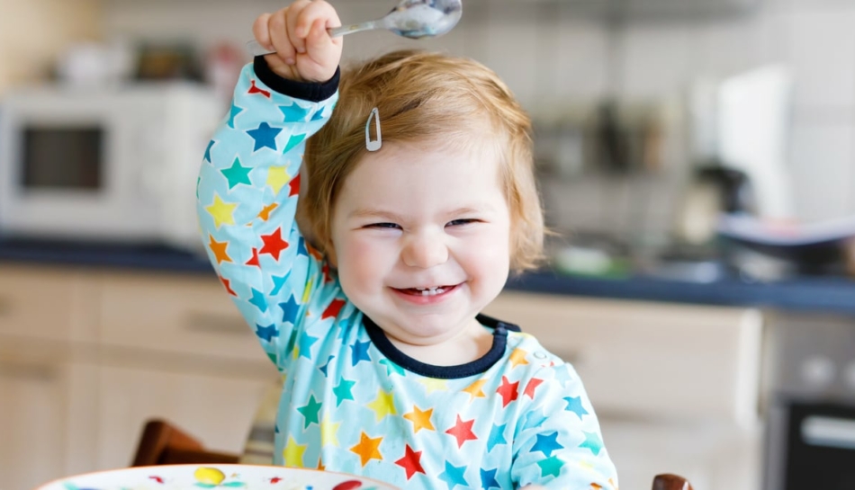Bambina piccola che agita ridendo il cucchiaio prima di mangiare, in un'atmosfera serena che evita lo sviluppo di disturbi alimentari