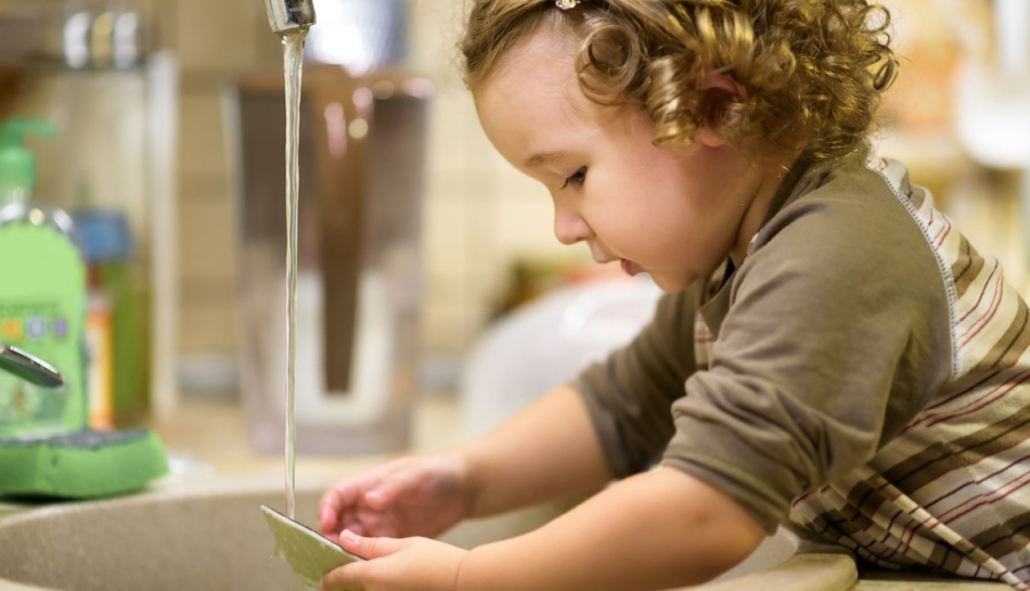 Bambina lava i piatti in autonomia