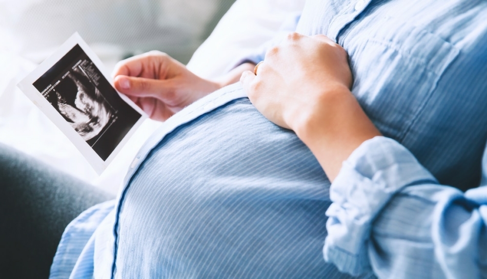 Primo piano della pancia di una donna in gravidanza che guarda un'ecografia
