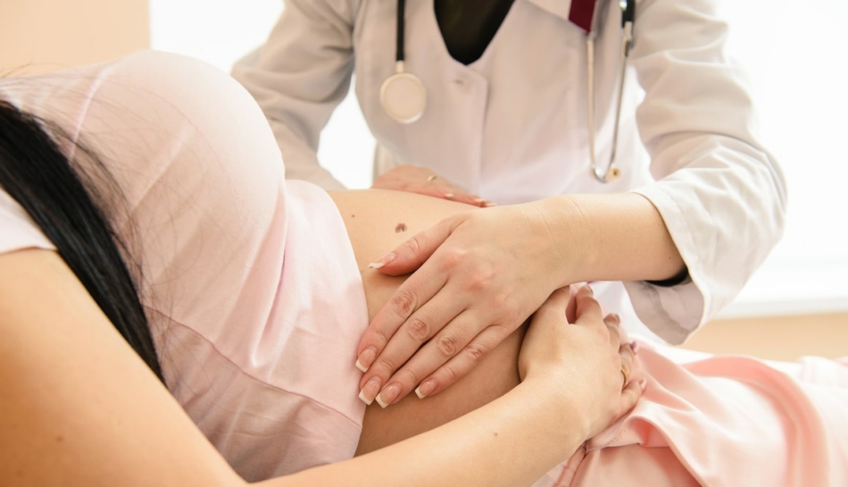 Primo piano di un dottore che verifica la posizione del feto in una gravidanza a termine, per verificare se si tratta di un parto podalico