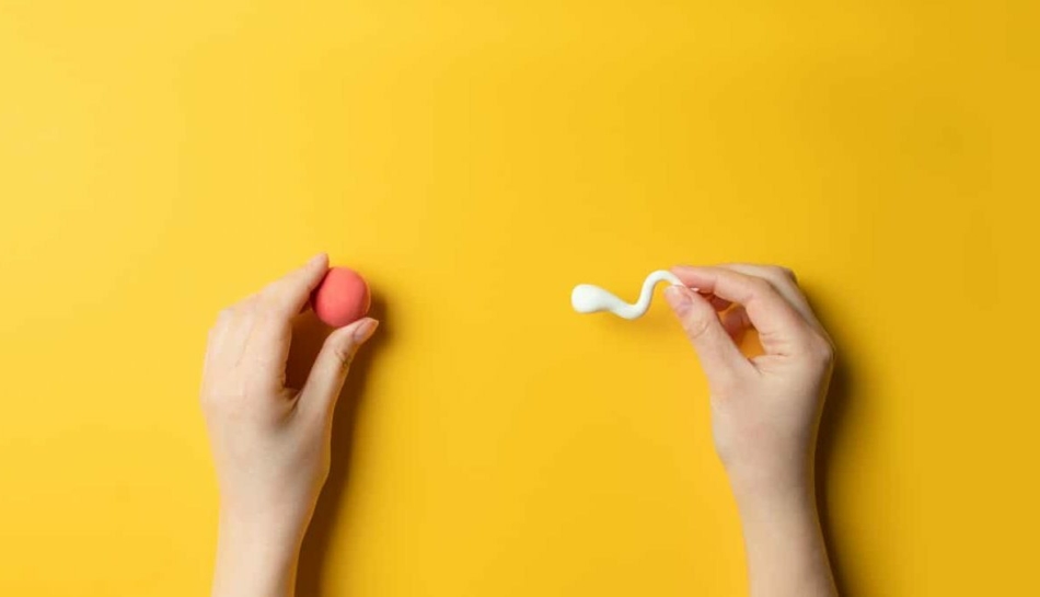 Mani che tengono le riproduzioni di un ovulo e di uno spermatozoo