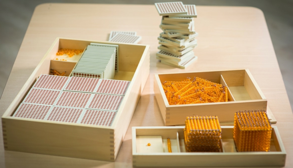 Per avvicinare i bambini alla matematica, Maria Montessori scelse la perla, un materiale prezioso, raro, da custodire; ciò ci fa ben comprendere l’amore che la Dottoressa riservava nella scelta del materiale per i suoi bambini e quanto la loro crescita intellettiva fosse per lei preziosa. Le perle si presentano sciolte per contare l’unità, legate “a bastoncino” per trattare le decine, “a cubo” per mostrare le centinaia, diventano “catena del 1000” e rimangono appese in classe a luccicare e attrarre i bimbi sin dai 3 anni d’età.