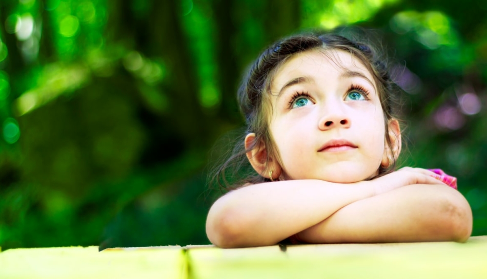 Primo piano di bambina che guarda pensierosa verso l'alto, appoggiata sugli avambracci