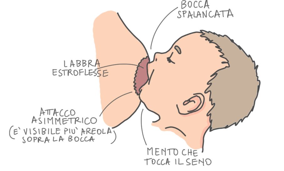 La causa più frequente di dolore alla suzione è l’attacco errato del bambino al seno. Se i neonati sfruttano i loro riflessi innati, favoriti da una posizione comoda e semi-reclinata della madre, per attaccarsi al seno spalancano la bocca cercando di far entrare più mammella possibile. Se invece i riflessi innati sono ostacolati da una posizione scomoda della madre (soprattutto quando questa è seduta in posizione eretta), i neonati possono far entrare in bocca una porzione ridotta di mammella e di conseguenza non riescono a portare il capezzolo in fondo alla bocca. In questo modo, ogni volta che ciucciano schiacciano il capezzolo contro la parte iniziale del palato (un punto molto duro), causando dolore ed eventuali ferite sul capezzolo.
